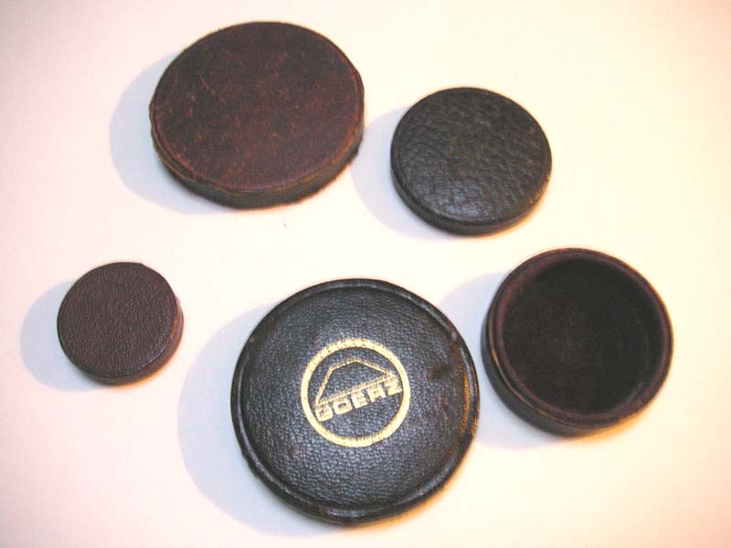 Unless otherwise noted, all of our leather caps are lined with felt or similar, so the diameter given is approximate and refers to the lens barrel that the caps might fit on. They may also fit a lens that is a bit larger or smaller than the dimension. Cost is $5 each unless otherwise specified. Some have names on them, printed or embossed, and this is noted. Also, most are black in color.